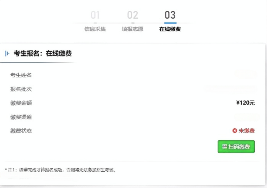 填报志愿后,点击右侧 “在线缴费”。考生确认报名信息无误后,点击“扫码缴费”按照页面提示信息,使用微信扫码缴费。支付成功后缴费状态更新为“已缴费”。
