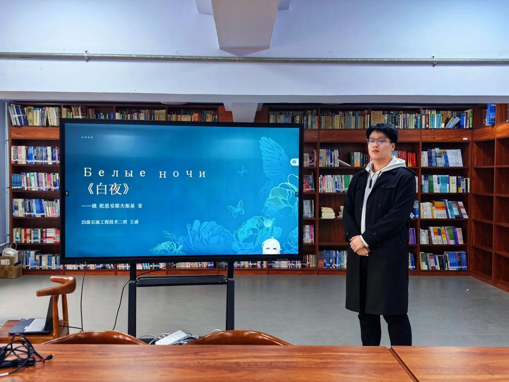 石油工程技术专业王盛同学带来陀思妥耶夫斯基的《白夜》,带领大家走进主人公“幻想者”的内心世界。他通过起始-相知-高潮-结尾梳理故事脉络,详细介绍三位书中的主要人物,通过情节摘抄展示书中的精彩桥段,并在最后告诉大家:“即使在迷茫与疏离中,也要始终保有对真实连接的渴望与勇敢尝试的力量。”