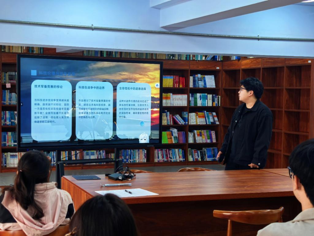 最后,化工技术专业田浩男同学带来刘慈欣的科幻经典《全频带阻塞干扰》,讲述高科技战争背景下,弱者为反抗“降维打击”而做出的牺牲与坚守,解读战争的本质与人性的光辉。他讲道:“真正的英雄主义不在于战胜敌人,而在于明知牺牲仍选择前行。”让大家感悟到集体主义精神与舍生取义的价值。