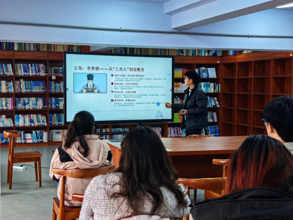 历史与现实的碰撞在《长安的荔枝》中展现得淋漓尽致,应用化工专业计博弈同学为大家讲述唐代小吏李善德为按时将新鲜荔枝从岭南运往长安,历经千难万险的故事。并在最后引用主人公的“就算失败,我也想知道,自己倒在距离终点多远的地方。”感悟李善德的信念,亦是大家面对困境时的精神力量。