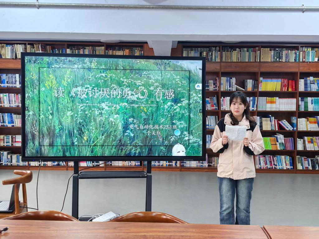 在快节奏的校园生活中,内耗与焦虑时常相伴,电气自动化技术专业于美红同学《被讨厌的勇气》的分享恰如一场“心灵疗愈”。她用“课题分离”、“活在当下”等理念,告诉同学们:“人生的烦恼多源于人际关系的纠缠,唯有接纳自我、拒绝内耗,敢于拥有被讨厌的勇气,才能获得真正的自由与幸福。”