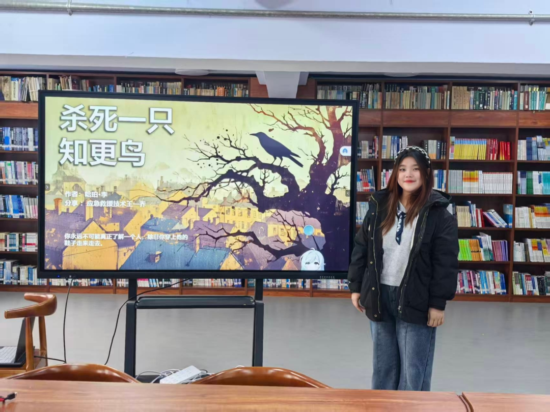 应急救援技术专业王一乔同学分享的《杀死一只知更鸟》聚焦“正义与善良”,她结合书中父亲阿迪克斯为黑人男孩辩护的故事,感悟勇气的真正含义——不是无所畏惧,而是明知艰难,依然坚守正义、坚守本心。她说到:“在现实生活中,这意味着要勇于站出来,对抗不公和不义。无论结果如何,坚持正义本身就是一种胜利。”